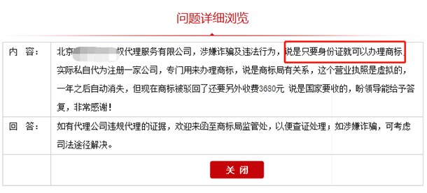 内 容: 北京某某知识产权代理服务有限公司,涉嫌诈骗及违法行为,说是只要身份证就可以办理商标,实际私自代为注册一家公司,专门用来办理商标,说是商标局有关系,这个营业执照是虚拟的,一年之后自动消失,但现在商标被驳回了还要另外收费3680元 说是国家要收的,盼领导能给予答复,非常感谢!