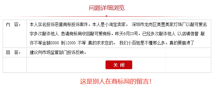 中国国家工商行政管理总局商标局收费多少钱一个? 国家工商总局商标局收费标准:1、国家知识产权商标局收费目前我国的商标分为45个类别,不同的类别包含不同的产品或服务。商标局收费:1个分...可以看到这位卖家由于没注册商标,收到了商标侵权的投诉。所以很多时候,你不注册商标,别人会帮你注册,然后你就等着赔偿吧。注册一个商标才几百块钱,投诉一次赔偿3000-12000元,你不注册下次还投诉你,还得赔偿。这就是淘宝小卖家不注重商标得危害。所以应该即使注册商标。 本人实名投诉恶意商标投诉案件。本人是小淘宝卖家。 深圳市龙岗区美置美家灯饰厂以敲可爱名字多次敲诈他人 恳请商标局收回敲可爱商标。昨天6月23号。已经多次敲诈他人 以店铺信誉 敲诈不等金额3000 到12000 不等 真的求求您的。 我们小百姓是不懂那么多。真的要崩溃了。