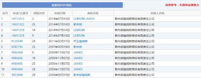 除了在美国注册商标之外,詹姆斯在中国也有不少的商标注册。"小皇帝"从2004年3月2日开始在华注册商标,目前一共注册了44个商标左右,囊括了3,9,14,18,25,28六个类别,后续增长变缓。当然,也有一些中国企业抢注了与詹姆斯有关的商标,詹皇在维权方面也毫不手软,而且有专业团队为其保驾护航。