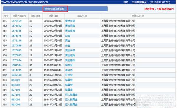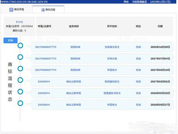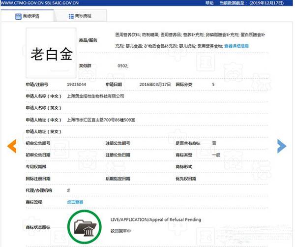经过不断的完善,截至目前,该公司共申请注册了368件商标。 不过,近期,上海黄金搭档公司在注册一枚“老白金”商标时,却遇到了困难。 “老白金”商标被驳回? 上海黄金搭档公司于2016年3月17日申请注册了第19335044号“老白金”商标(以下称申请商标),核定使用范围为第5类的“医用营养饮料,医用营养品,矿物质食品补充剂,婴儿奶粉”等商品上。