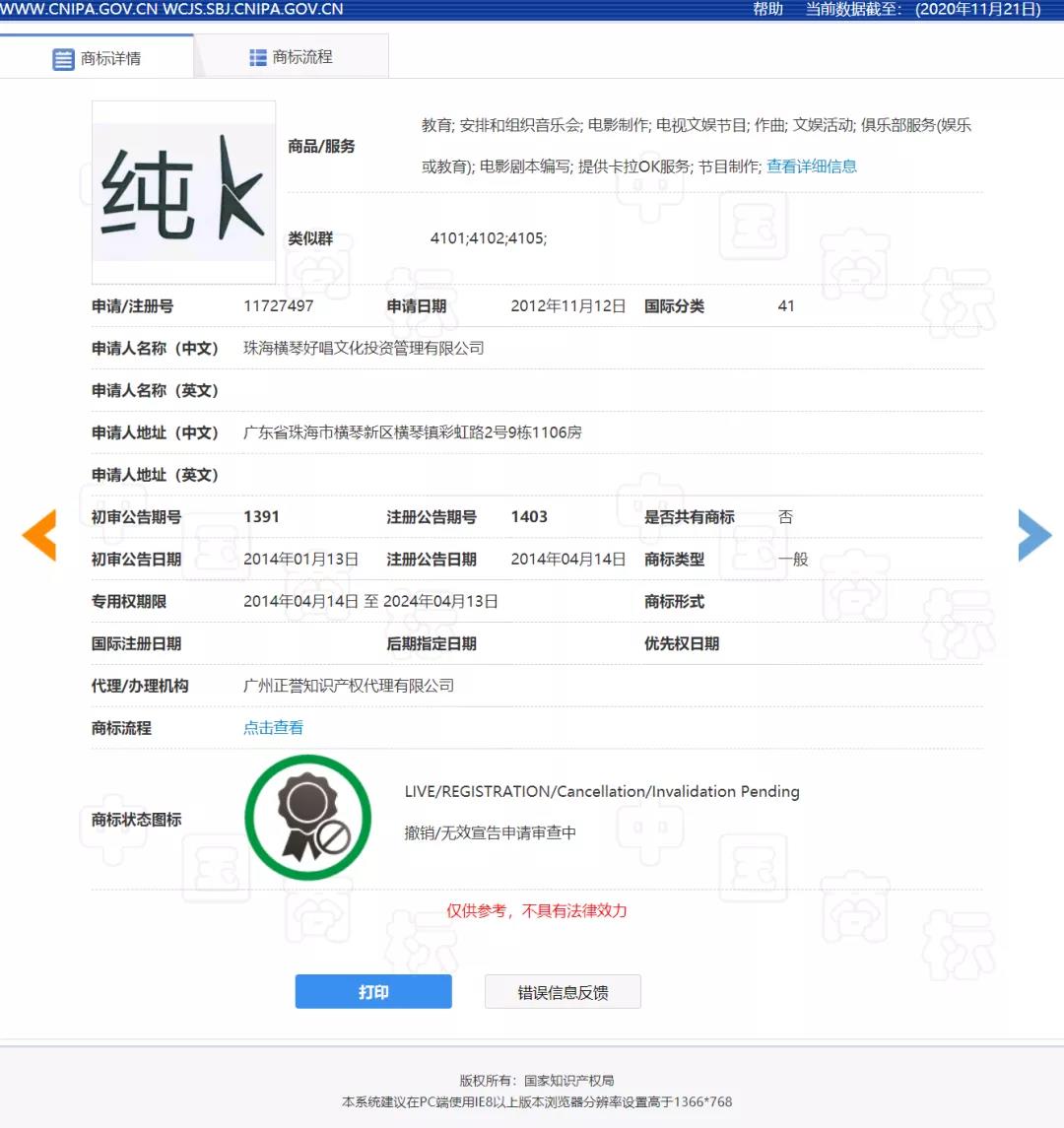 商标案例:美团异议失败之“美团智能锁MYTAN”商标准予注册唱K已经是现代都市生活不可或缺的娱乐活动,嗨唱之余,或曾注意那霓虹灯下闪亮的灯牌?日前,多家公司就因这KTV的门店招牌走进法院……因为珠海好唱文化公司(下文简称A公司)依法享有第11727497号“纯K”和第11727503号“纯K”注册商标的专用权,核定服务项目均为第 41 类:文娱活动;俱乐部服务(娱乐或教育);提供卡拉 OK 服务;且该商标还处于注册有效期内,有着巨大的品牌价值和商业利益。