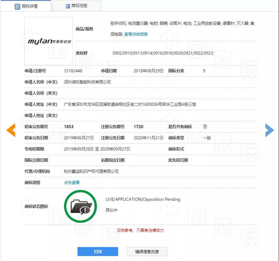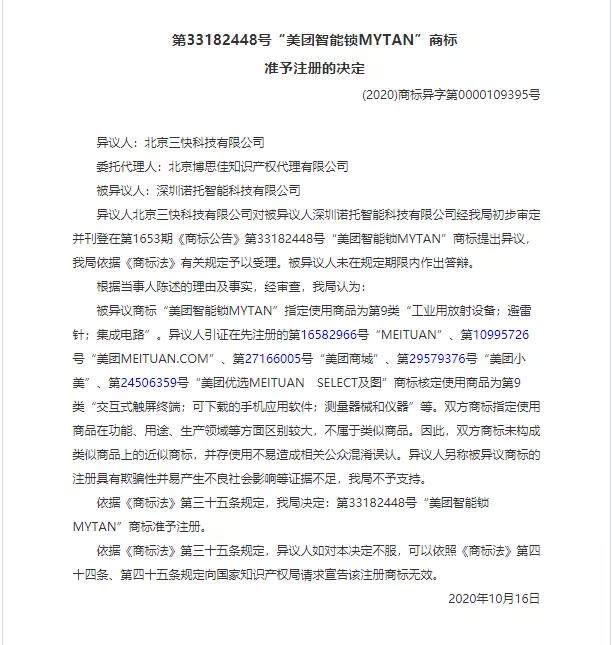 经审查,商标局认为:被异议商标“美团智能锁MYTAN”指定使用商品为第9类“工业用放射设备;避雷针;集成电路”。与美团公司在先注册的第16582966号“MEITUAN”、第10995726号“美团MEITUAN.COM”、第27166005号“美团商城”、第29579376号“美团小美”、第24506359号“美团优选MEITUAN SELECT及图”商标 在功能、用途、生产领域等方面区别较大,不属于类似商品。因此,双方商标未构成类似商品上的近似商标,并存使用不易造成相关公众混淆误认。