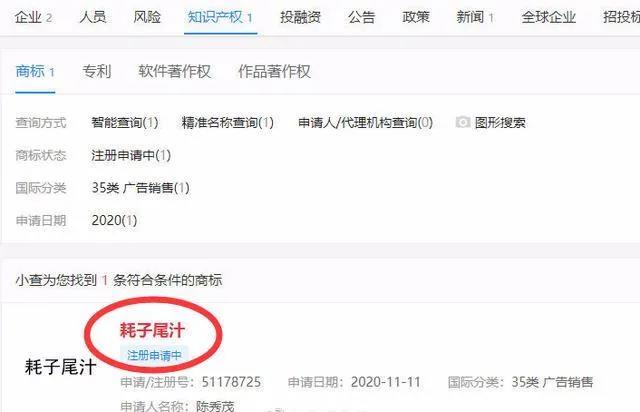 有流量自然就会有商业价值,在马保国5月份输掉比赛后,就有商家迅速注册了“马保国”这个商标,更加令人万万没想到的是,目前“耗子尾汁”已经被抢注商标。 据企查查显示,“耗子尾汁”于11月11号被申请注册商标,国际分类为35类广告销售,申请人为陈秀茂,商标类型为普通商标,商标状态为“注册申请中”。