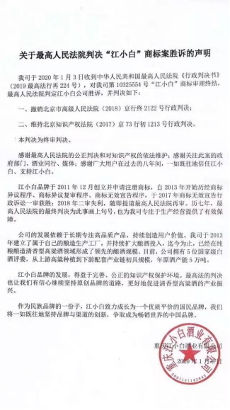 首先让我们来了解一下这个长达7年之争的白酒品牌“江小白” 江小白是重庆江小白酒业有限公司旗下江记酒庄酿造生产的一种自然发酵并蒸馏的高粱酒品牌。 2020年1月6日,重庆江小白酒业有限公司发布声明称,公司于1月3日收到最高人民法院终审判决书, 与重庆市江津酒厂(集团)有限公司之间的“江小白”商标之争,最高法维持一审判决,撤销了商标评 审委员会此前做出的第10325554号“江小白”商标无效宣告的裁定,并要求委员会重新裁定。“江小白” 商标最终还是回归了江小白公司